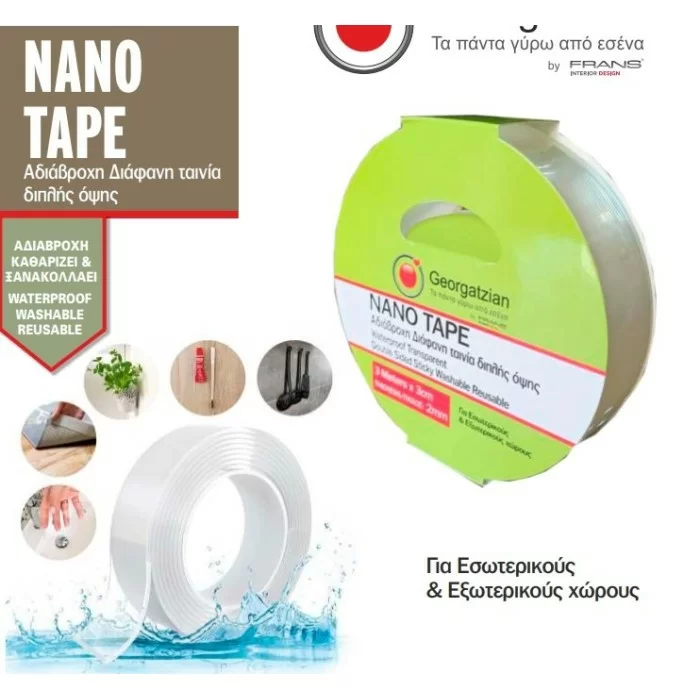 Διάφανη ταινία διπλής όψης κατάλληλη για εσωτερικούς και εξωτερικούς χώρους. Αδιάβροχη