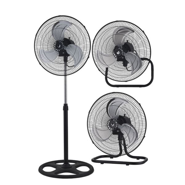 Ανεμιστήρας μεταλλικός 3 σε 1 ισχυρός και πολυλειτουργικός, ιδανικός για το δάπεδο,τον τοίχο ή το τραπέζι.Διαθέτει 3 ταχύτητες λειτουργίας,περιστροφή 90 μοιρών,3 πτερύγια αλουμινίου 45εκ.,δικτυωτό πλέγμα ασφαλείας,ρυθμιζόμενο ύψος κ στιβαρή στρογγυλή βάση
