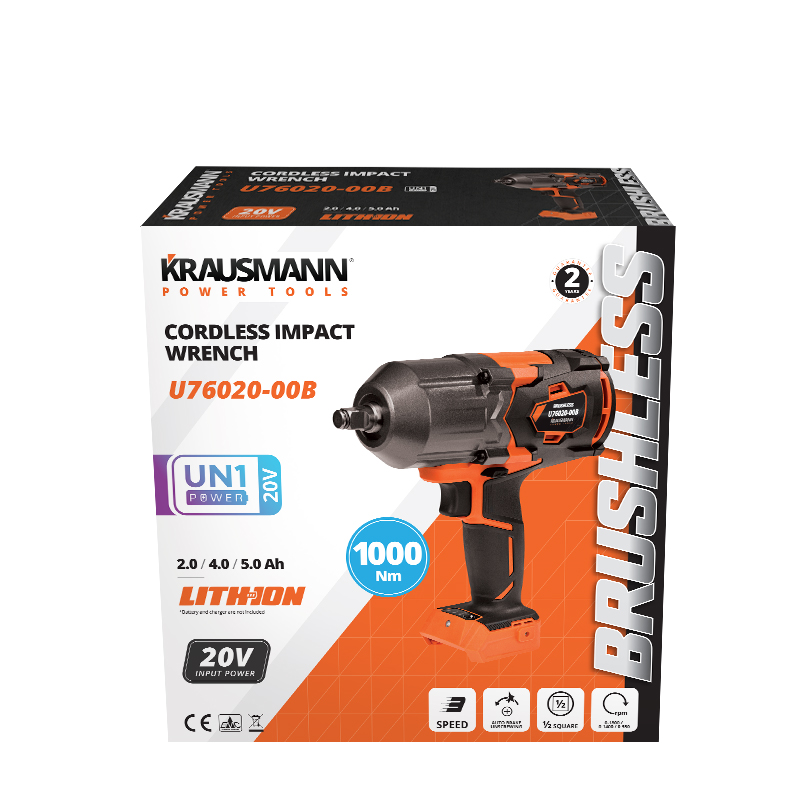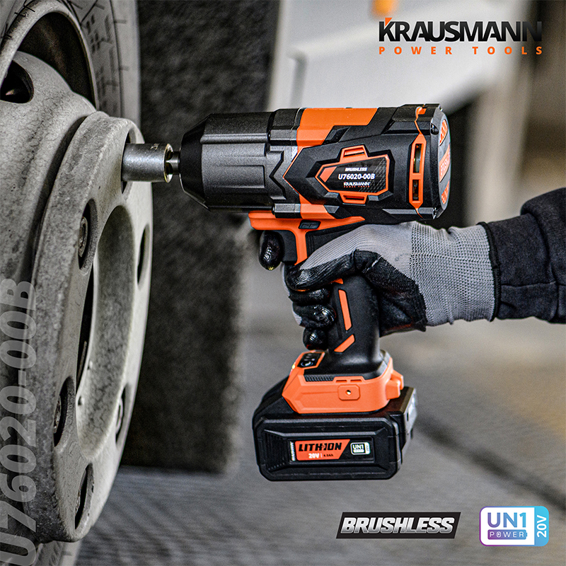 Μπουλονόκλειδο επαναφορτιζόμενο KRAUSMANN® U76020-00B υψηλής ροπής 1000Nm με αυτόματο φρένο στο ξεβίδωμα, ιδανικό για βίδωμα ή ξεβίδωμα μπουλονιών και παξιμαδιών.