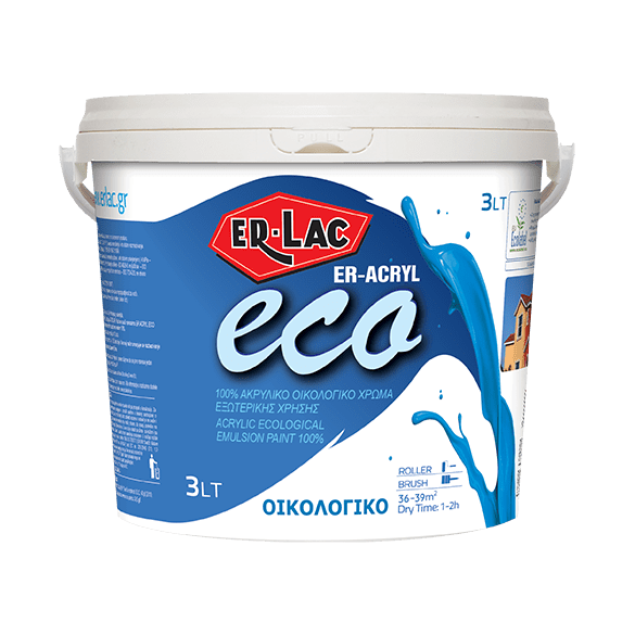 Το ER-ACRYL ECO είναι ένα άοσμο, υψηλής ποιότητας χρώμα γαλακτώματος ακρυλικής βάσης. Είναι πιστοποιημένο από τον ASAOS και πληροί τα κριτήρια του Συμβουλίου Οικολογικού Σήματος της Ευρωπαϊκής Ένωσης. Η ειδική καινοτόμος σύνθεσή του δεν μολύνει το περιβάλλον και παρέχει προστασία στον χρήστη. Συνδυάζει μεγάλη λευκότητα, ισχύ απόκρυψης (7,57 m2/L για πλήρη κάλυψη 98% – ISO 6504/3), ευκολία εφαρμογής και εξαιρετική ισοπέδωση. Έχει μεγάλη αντοχή στη διαπερατότητα του νερού (Κλάση 3 – DIN EN 1062-3:1999). Έχει εξαιρετική αντοχή σε ακραίες καιρικές συνθήκες, πολύ καλή πρόσφυση (4 Mpa- ISO 4624) και αντοχή στη γήρανση (χωρίς κιμωλίαση – ISO 4628-6, χωρίς ξεφλούδισμα ISO 4628-5, χωρίς ρωγμές – ISO 4628-4, χωρίς αλλοιώσεις χρώμα με την πάροδο του χρόνου – ISO 7724-2/3, χωρίς φυσαλίδες – ISO 4628-2). Έχει πολύ καλή αντοχή στα αλκάλια – ISO 2812-4:2007. Παρέχει υψηλή κάλυψη και πολύ καλό άπλωμα επίστρωσης.
