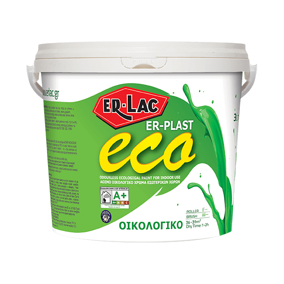 Το ER-PLAST ECO είναι άοσμο οικολογικό πλαστικό χρώμα εξαιρετικής ποιότητας για εσωτερική χρήση. Είναι πιστοποιημένο από τον ΑΣΑΟΣ σύμφωνα με τα κριτήρια του Συμβουλίου Απονομής Οικολογικού Σήματος της Ε.Ε. Η ειδική πρωτοποριακή του σύνθεση δε ρυπαίνει το περιβάλλον και παρέχει αυξημένη ασφάλεια στο χρήστη. Είναι κατάλληλο για επιφάνειες από σοβά, μπετόν, γυψοσανίδες, τσιμέντο κ.α. Είναι ιδανικό για παιδικά δωμάτια, νοσοκομεία σχολεία και παιδικούς σταθμούς αλλά και γενικά για όλους τους εσωτερικούς χώρους. Εφαρμόζεται εύκολα, έχει μεγάλη καλυπτικότητα και εξαιρετική λευκότητα. Δεν λερώνει, καθαρίζεται εύκολα και παρουσιάζει εξαιρετικές αντοχές στο πλύσιμο υπερκαλύπτοντας τις απαιτήσεις της δοκιμής έκπλυσης. Οι αντοχές του είναι τόσο μεγάλες, ώστε σύμφωνα με το test EN 13300 και EN ISO 11998 το χρώμα αντέχει στο πλύσιμο με βούρτσα. Έχει πιστοποιηθεί στη κατηγορία Α+ για τη Ποιότητα Αέρα Εσωτερικών Χώρων σύμφωνα με το Γαλλικό VOC Πρότυπο από το διαπιστευμένο εργαστήριο Eurofins. Είναι «Προϊόν Χαμηλών Εκπομπών» σύμφωνα με το πρότυπο LEED v4.1 για την αξιολόγηση των Πράσινων Κτηρίων. Χρωματίζεται σε χιλιάδες αποχρώσεις.