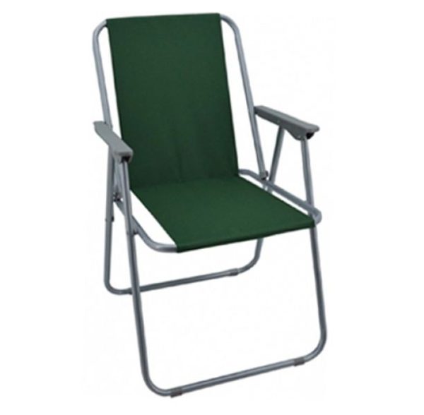 Καρεκλά πτυσσόμενη με μεταλλικό γκρι σκελετό, σωλήνα διαμέτρου 18mm, πάχος 1,0mm και πολυεστερικό ύφασμα oxford 600D σε σκούρο πράσινο χρώμα.