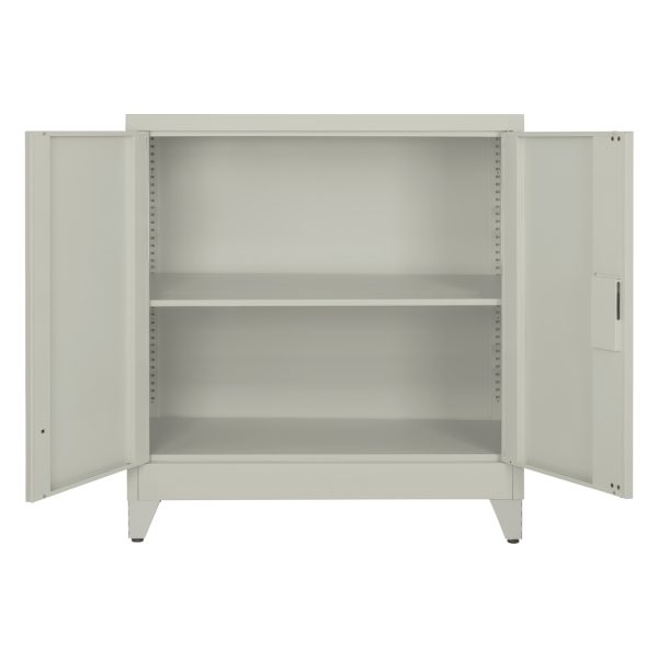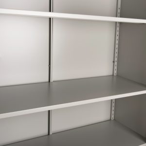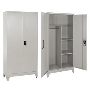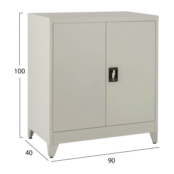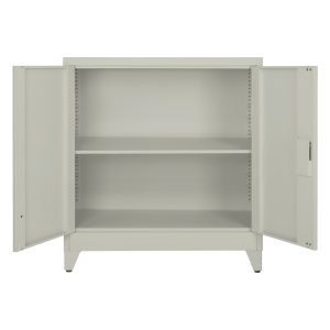 Η DURON είναι μια πρακτικότατη κοντή μεταλλική ντουλάπα με πόδια, που έχει φτιαχτεί με γνώμονα την χωρητικότητα για το μέγεθός της και την ανθεκτικότητα. Είναι δίφυλλη με τις δύο πόρτες να κλείνουν ακριβώς στην μέση της κατασκευής, ενώ το εσωτερικό είναι ένας ενιαίος χώρος χωρίς κάθετα χωρίσματα. Διαθέτει 2 ράφια που δημιουργούν 3 αποθηκευτικούς χώρους. Οι πόρτες διαθέτουν κλειδαριά που κλειδώνει με κλειδί, ενώ το χρώμα της ντουλάπας είναι πολύ ανοιχτό γκρι.