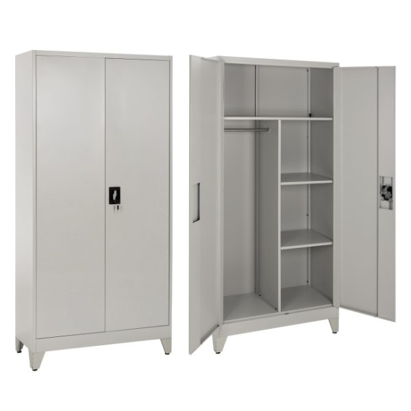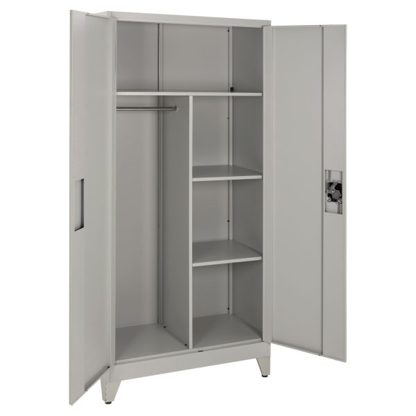 Η CLOD είναι μια πρακτικότατη μεταλλική ντουλάπα με πόδια, που έχει φτιαχτεί με γνώμονα την χωρητικότητα και την ανθεκτικότητα. Είναι δίφυλλη με τις δύο πόρτες να κλείνουν ακριβώς στην μέση της κατασκευής, ενώ το εσωτερικό είναι χωρισμένο σε 3 κύριους χώρους με μεταλλικό χώρισμα σε σχήμα Τ. Το επάνω μέρος είναι ενιαίο σαν παταράκι, ενώ η μία πλευρά διαθέτει μεταλλική μπάρα για κρέμαση αντικειμένων και η άλλη διαθέτει 2 ράφια που δημιουργούν 3 επίπεδα αποθήκευσης. Οι πόρτες διαθέτουν κλειδαριά που κλειδώνει με κλειδί, ενώ το χρώμα της ντουλάπας είναι πολύ ανοιχτό γκρι.