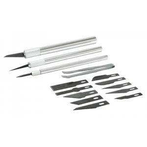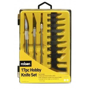 Σετ μαχαιριών Hobby 17 τεμαχίων Περιλαμβάνει λεπίδες 13 τμχ σκληρυμένες σε διάφορα σχήματα. Περιλαμβάνει ένα τσιμπιδάκι και 3 λαβές αλουμινίου. Κατάλληλο για κοπή, γρατσουνιά, χάραξη, ξύσιμο, διάταξη και κατασκευή μοντέλων. Όλα έρχονται σε μια εύχρηστη θήκη αποθήκευσης με κλιπ.